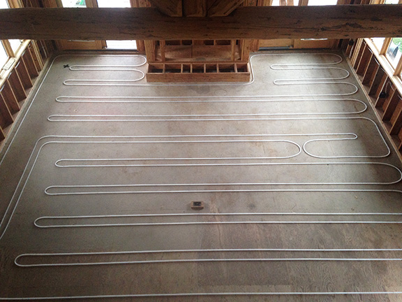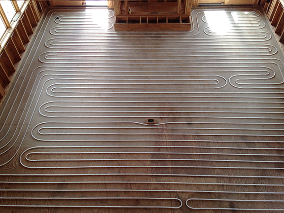 Oxygen barrier tubing stapled to the floor using a single or double loop counterflow layout. Hooked up to the manifold in a supply return supply return fashion. This ensures the most consistent and even temperature across the whole floor. Compared to starting at one end and ending at another, having a 20 degree difference in water temp.